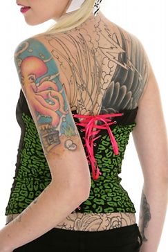 This black tube top has brass knuckles constructed of pink faceted grommets on the front and a lime green leopard back with a hot pink lace-up detail.