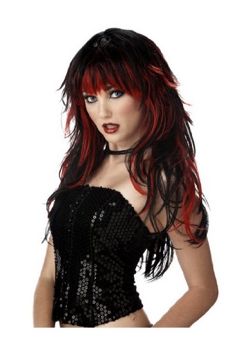 Womens Tempting Tresses Punk Pop Rock Star Goth Emo 80s Rock and Roll Long Black & Red Costume Wig